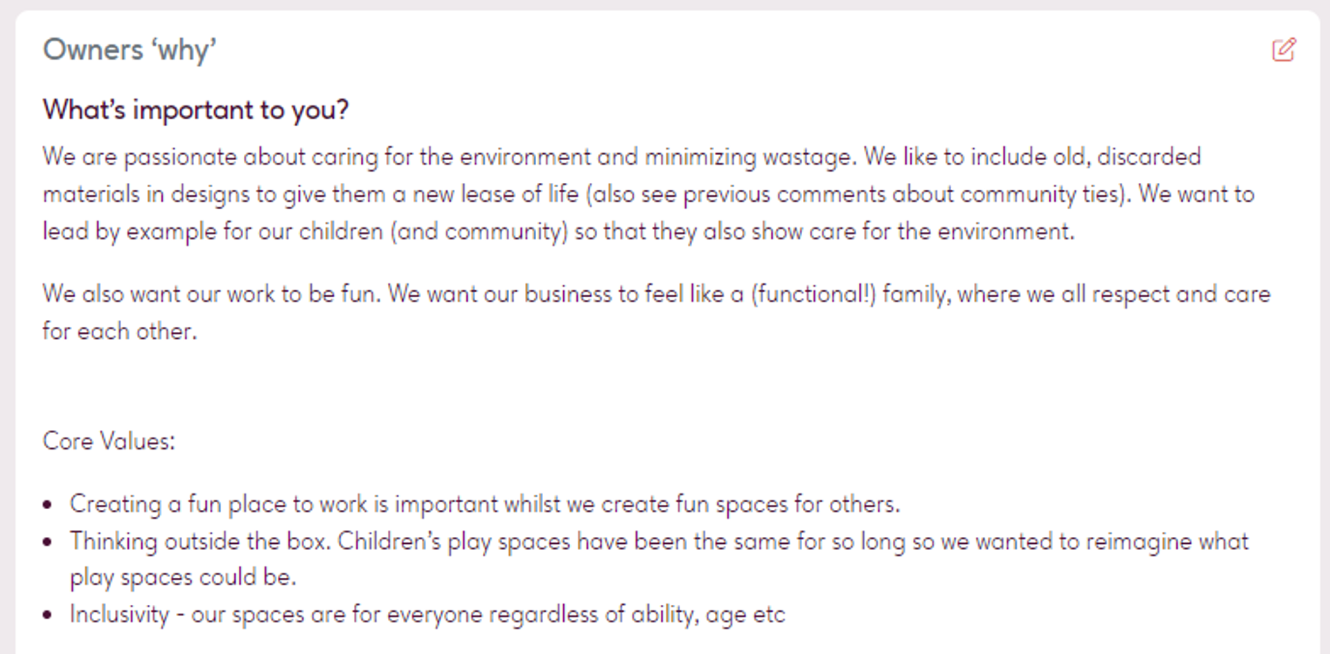 This is about stories and experiences you think are important for people to help understand how your why correlates with the business why.