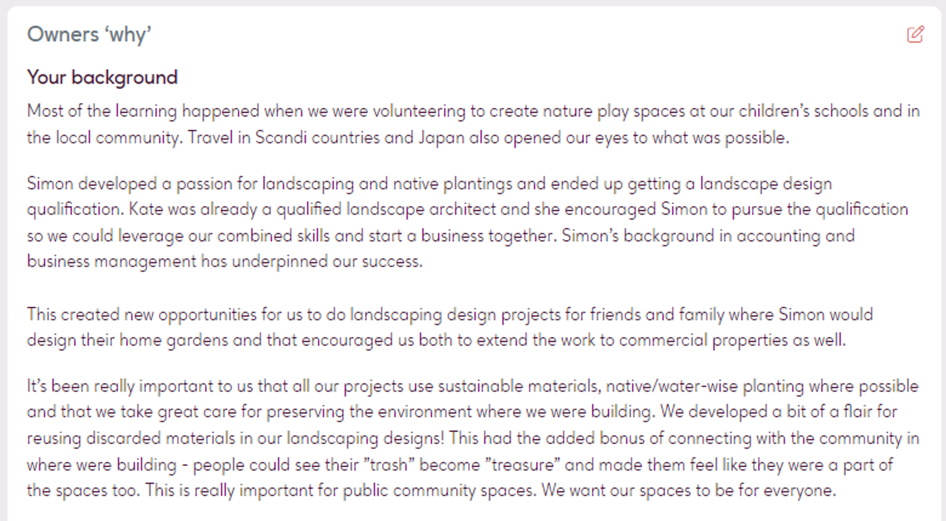 We're primarily trying to understand what it is about your particular strengths and skills that made you start the business?